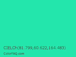 CIELCh 81.799,60.622,164.483 Color is a normal green color and the nearest color is Eucalyptus #44d7a8. Hex code #25e6ab and RGB value is rgb(37,230,171). In RGB color space, this color is composed of 15% red, 90% green, 67% blue, In CMYK color space, this color is composed of 84% cyan, 0% magenta, 26% yellow , 10% black , In HSL color space, this color has a hue angle of 162° , 79% saturation and 52% lightness.