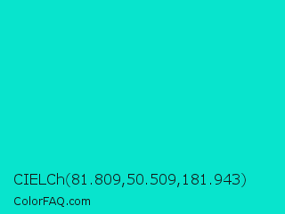 CIELCh 81.809,50.509,181.943 Color is a normal cyan color and the nearest color is Bright Turquoise #08e8de. Hex code #08e4cd and RGB value is rgb(8,228,205). In RGB color space, this color is composed of 3% red, 89% green, 80% blue, In CMYK color space, this color is composed of 96% cyan, 0% magenta, 10% yellow , 11% black , In HSL color space, this color has a hue angle of 174° , 93% saturation and 46% lightness.