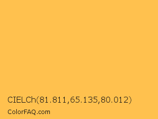 CIELCh 81.811,65.135,80.012 Color is a light orange color and the nearest color is Saffron Mango #f9bf58. Hex code #ffc14e and RGB value is rgb(255,193,78). In RGB color space, this color is composed of 100% red, 76% green, 31% blue, In CMYK color space, this color is composed of 0% cyan, 24% magenta, 69% yellow , 0% black , In HSL color space, this color has a hue angle of 39° , 100% saturation and 65% lightness.