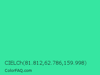 CIELCh 81.812,62.786,159.998 Color is a normal green color and the nearest color is Eucalyptus #44d7a8. Hex code #36e6a1 and RGB value is rgb(54,230,161). In RGB color space, this color is composed of 21% red, 90% green, 63% blue, In CMYK color space, this color is composed of 77% cyan, 0% magenta, 30% yellow , 10% black , In HSL color space, this color has a hue angle of 156° , 78% saturation and 56% lightness.