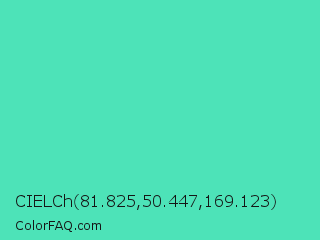CIELCh 81.825,50.447,169.123 Color is a normal green color and the nearest color is Eucalyptus #44d7a8. Hex code #4de3b8 and RGB value is rgb(77,227,184). In RGB color space, this color is composed of 30% red, 89% green, 72% blue, In CMYK color space, this color is composed of 66% cyan, 0% magenta, 19% yellow , 11% black , In HSL color space, this color has a hue angle of 163° , 73% saturation and 60% lightness.
