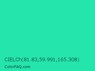 CIELCh 81.83,59.991,165.308 Color is a normal green color and the nearest color is Turquoise PWG #30d5c8. Hex code #24e6ad and RGB value is rgb(36,230,173). In RGB color space, this color is composed of 14% red, 90% green, 68% blue, In CMYK color space, this color is composed of 84% cyan, 0% magenta, 25% yellow , 10% black , In HSL color space, this color has a hue angle of 162° , 80% saturation and 52% lightness.