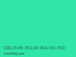 CIELCh 81.852,60.904,162.932 Color is a normal green color and the nearest color is Eucalyptus #44d7a8. Hex code #2fe6a8 and RGB value is rgb(47,230,168). In RGB color space, this color is composed of 18% red, 90% green, 66% blue, In CMYK color space, this color is composed of 80% cyan, 0% magenta, 27% yellow , 10% black , In HSL color space, this color has a hue angle of 160° , 79% saturation and 54% lightness.