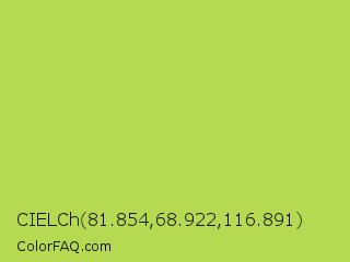 CIELCh 81.854,68.922,116.891 Color is a normal lime color and the nearest color is Conifer #acdd4d. Hex code #b5d950 and RGB value is rgb(181,217,80). In RGB color space, this color is composed of 71% red, 85% green, 31% blue, In CMYK color space, this color is composed of 17% cyan, 0% magenta, 63% yellow , 15% black , In HSL color space, this color has a hue angle of 76° , 64% saturation and 58% lightness.