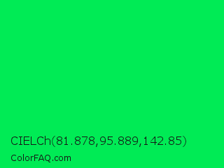 CIELCh 81.878,95.889,142.85 Color is a normal green color and the nearest color is Malachite #0bda51. Hex code #00eb55 and RGB value is rgb(0,235,85). In RGB color space, this color is composed of 0% red, 92% green, 33% blue, In CMYK color space, this color is composed of 100% cyan, 0% magenta, 64% yellow , 8% black , In HSL color space, this color has a hue angle of 142° , 100% saturation and 46% lightness.