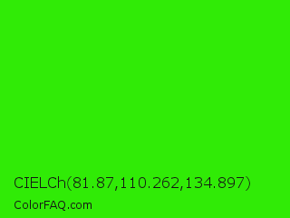 CIELCh 81.87,110.262,134.897 Color is a normal green color and the nearest color is Harlequin #3fff00. Hex code #30eb06 and RGB value is rgb(48,235,6). In RGB color space, this color is composed of 19% red, 92% green, 2% blue, In CMYK color space, this color is composed of 80% cyan, 0% magenta, 97% yellow , 8% black , In HSL color space, this color has a hue angle of 109° , 95% saturation and 47% lightness.