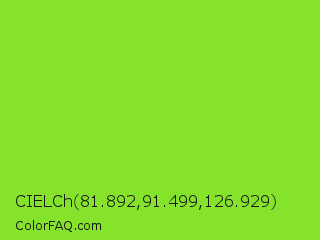 CIELCh 81.892,91.499,126.929 Color is a normal green color and the nearest color is Kiwi #8ee53f. Hex code #85e32b and RGB value is rgb(133,227,43). In RGB color space, this color is composed of 52% red, 89% green, 17% blue, In CMYK color space, this color is composed of 41% cyan, 0% magenta, 81% yellow , 11% black , In HSL color space, this color has a hue angle of 91° , 77% saturation and 53% lightness.