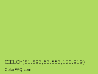 CIELCh 81.893,63.553,120.919 Color is a light green color and the nearest color is June Bud #bdda57. Hex code #afda60 and RGB value is rgb(175,218,96). In RGB color space, this color is composed of 69% red, 85% green, 38% blue, In CMYK color space, this color is composed of 20% cyan, 0% magenta, 56% yellow , 15% black , In HSL color space, this color has a hue angle of 81° , 62% saturation and 62% lightness.