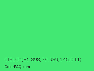 CIELCh 81.898,79.989,146.044 Color is a normal green color and the nearest color is UFO Green #3cd070. Hex code #42e873 and RGB value is rgb(66,232,115). In RGB color space, this color is composed of 26% red, 91% green, 45% blue, In CMYK color space, this color is composed of 72% cyan, 0% magenta, 50% yellow , 9% black , In HSL color space, this color has a hue angle of 138° , 78% saturation and 58% lightness.