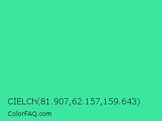 CIELCh 81.907,62.157,159.643 Color is a normal green color and the nearest color is Eucalyptus #44d7a8. Hex code #3ce6a1 and RGB value is rgb(60,230,161). In RGB color space, this color is composed of 24% red, 90% green, 63% blue, In CMYK color space, this color is composed of 74% cyan, 0% magenta, 30% yellow , 10% black , In HSL color space, this color has a hue angle of 156° , 77% saturation and 57% lightness.