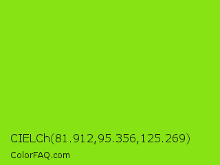 CIELCh 81.912,95.356,125.269 Color is a normal green color and the nearest color is Alien Armpit #84de02. Hex code #87e313 and RGB value is rgb(135,227,19). In RGB color space, this color is composed of 53% red, 89% green, 7% blue, In CMYK color space, this color is composed of 41% cyan, 0% magenta, 92% yellow , 11% black , In HSL color space, this color has a hue angle of 87° , 85% saturation and 48% lightness.