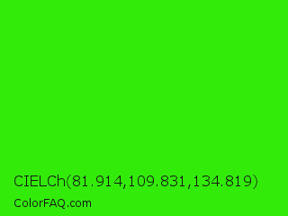 CIELCh 81.914,109.831,134.819 Color is a normal green color and the nearest color is Neon Green #39ff14. Hex code #33eb09 and RGB value is rgb(51,235,9). In RGB color space, this color is composed of 20% red, 92% green, 4% blue, In CMYK color space, this color is composed of 78% cyan, 0% magenta, 96% yellow , 8% black , In HSL color space, this color has a hue angle of 109° , 93% saturation and 48% lightness.