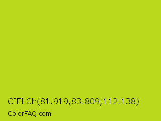 CIELCh 81.919,83.809,112.138 Color is a normal yellow color and the nearest color is Fuego #bede0d. Hex code #bad91c and RGB value is rgb(186,217,28). In RGB color space, this color is composed of 73% red, 85% green, 11% blue, In CMYK color space, this color is composed of 14% cyan, 0% magenta, 87% yellow , 15% black , In HSL color space, this color has a hue angle of 70° , 77% saturation and 48% lightness.
