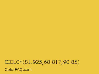 CIELCh 81.925,68.817,90.85 Color is a normal yellow color and the nearest color is Sandstorm #ecd540. Hex code #edc941 and RGB value is rgb(237,201,65). In RGB color space, this color is composed of 93% red, 79% green, 25% blue, In CMYK color space, this color is composed of 0% cyan, 15% magenta, 73% yellow , 7% black , In HSL color space, this color has a hue angle of 47° , 83% saturation and 59% lightness.