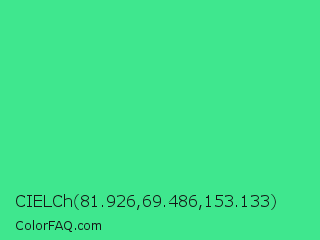 CIELCh 81.926,69.486,153.133 Color is a normal green color and the nearest color is Eucalyptus #44d7a8. Hex code #3fe78e and RGB value is rgb(63,231,142). In RGB color space, this color is composed of 25% red, 91% green, 56% blue, In CMYK color space, this color is composed of 73% cyan, 0% magenta, 39% yellow , 9% black , In HSL color space, this color has a hue angle of 148° , 78% saturation and 58% lightness.