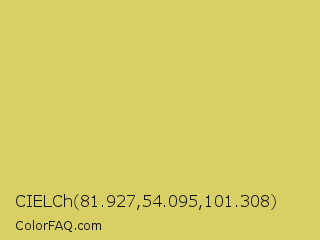 CIELCh 81.927,54.095,101.308 Color is a light yellow color and the nearest color is Tacha #d6c562. Hex code #d8cf65 and RGB value is rgb(216,207,101). In RGB color space, this color is composed of 85% red, 81% green, 40% blue, In CMYK color space, this color is composed of 0% cyan, 4% magenta, 53% yellow , 15% black , In HSL color space, this color has a hue angle of 55° , 60% saturation and 62% lightness.