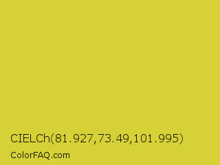 CIELCh 81.927,73.49,101.995 Color is a normal yellow color and the nearest color is Pear #d1e231. Hex code #d6d136 and RGB value is rgb(214,209,54). In RGB color space, this color is composed of 84% red, 82% green, 21% blue, In CMYK color space, this color is composed of 0% cyan, 2% magenta, 75% yellow , 16% black , In HSL color space, this color has a hue angle of 58° , 66% saturation and 53% lightness.