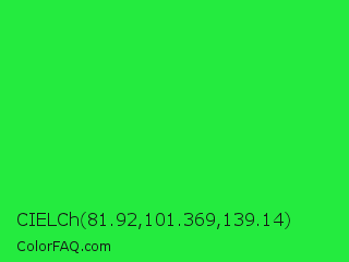 CIELCh 81.92,101.369,139.14 Color is a normal green color and the nearest color is Malachite #0bda51. Hex code #24eb3f and RGB value is rgb(36,235,63). In RGB color space, this color is composed of 14% red, 92% green, 25% blue, In CMYK color space, this color is composed of 85% cyan, 0% magenta, 73% yellow , 8% black , In HSL color space, this color has a hue angle of 128° , 83% saturation and 53% lightness.