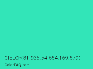 CIELCh 81.935,54.684,169.879 Color is a normal cyan color and the nearest color is Turquoise PWG #30d5c8. Hex code #32e5b8 and RGB value is rgb(50,229,184). In RGB color space, this color is composed of 20% red, 90% green, 72% blue, In CMYK color space, this color is composed of 78% cyan, 0% magenta, 20% yellow , 10% black , In HSL color space, this color has a hue angle of 165° , 77% saturation and 55% lightness.