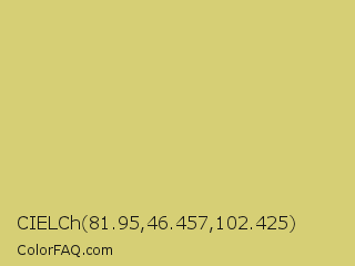CIELCh 81.95,46.457,102.425 Color is a light yellow color and the nearest color is Chenin #dfcd6f. Hex code #d6cf75 and RGB value is rgb(214,207,117). In RGB color space, this color is composed of 84% red, 81% green, 46% blue, In CMYK color space, this color is composed of 0% cyan, 3% magenta, 45% yellow , 16% black , In HSL color space, this color has a hue angle of 56° , 54% saturation and 65% lightness.