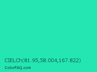 CIELCh 81.95,58.004,167.822 Color is a normal cyan color and the nearest color is Turquoise PWG #30d5c8. Hex code #23e6b3 and RGB value is rgb(35,230,179). In RGB color space, this color is composed of 14% red, 90% green, 70% blue, In CMYK color space, this color is composed of 85% cyan, 0% magenta, 22% yellow , 10% black , In HSL color space, this color has a hue angle of 164° , 80% saturation and 52% lightness.