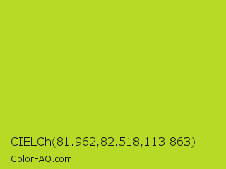 CIELCh 81.962,82.518,113.863 Color is a normal lime color and the nearest color is Key Lime Pie #bfc921. Hex code #b6da26 and RGB value is rgb(182,218,38). In RGB color space, this color is composed of 71% red, 85% green, 15% blue, In CMYK color space, this color is composed of 17% cyan, 0% magenta, 83% yellow , 15% black , In HSL color space, this color has a hue angle of 72° , 71% saturation and 50% lightness.