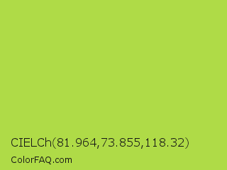 CIELCh 81.964,73.855,118.32 Color is a normal lime color and the nearest color is Conifer #acdd4d. Hex code #afdb47 and RGB value is rgb(175,219,71). In RGB color space, this color is composed of 69% red, 86% green, 28% blue, In CMYK color space, this color is composed of 20% cyan, 0% magenta, 68% yellow , 14% black , In HSL color space, this color has a hue angle of 78° , 67% saturation and 57% lightness.