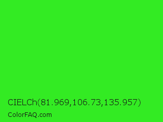CIELCh 81.969,106.73,135.957 Color is a normal green color and the nearest color is Neon Green #39ff14. Hex code #33eb23 and RGB value is rgb(51,235,35). In RGB color space, this color is composed of 20% red, 92% green, 14% blue, In CMYK color space, this color is composed of 78% cyan, 0% magenta, 85% yellow , 8% black , In HSL color space, this color has a hue angle of 115° , 83% saturation and 53% lightness.