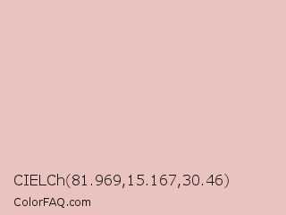 CIELCh 81.969,15.167,30.46 Color is a very light red color and the nearest color is Beauty Bush #eec1be. Hex code #eac3be and RGB value is rgb(234,195,190). In RGB color space, this color is composed of 92% red, 76% green, 75% blue, In CMYK color space, this color is composed of 0% cyan, 17% magenta, 19% yellow , 8% black , In HSL color space, this color has a hue angle of 7° , 51% saturation and 83% lightness.