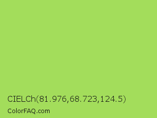 CIELCh 81.976,68.723,124.5 Color is a light green color and the nearest color is Conifer #acdd4d. Hex code #a3dd5b and RGB value is rgb(163,221,91). In RGB color space, this color is composed of 64% red, 87% green, 36% blue, In CMYK color space, this color is composed of 26% cyan, 0% magenta, 59% yellow , 13% black , In HSL color space, this color has a hue angle of 87° , 66% saturation and 61% lightness.
