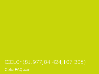 CIELCh 81.977,84.424,107.305 Color is a normal yellow color and the nearest color is Bitter Lemon #cae00d. Hex code #c7d609 and RGB value is rgb(199,214,9). In RGB color space, this color is composed of 78% red, 84% green, 4% blue, In CMYK color space, this color is composed of 7% cyan, 0% magenta, 96% yellow , 16% black , In HSL color space, this color has a hue angle of 64° , 92% saturation and 44% lightness.