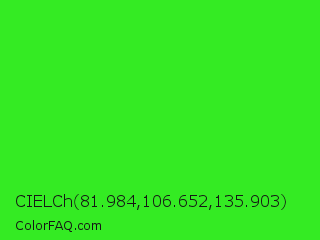 CIELCh 81.984,106.652,135.903 Color is a normal green color and the nearest color is Neon Green #39ff14. Hex code #34eb23 and RGB value is rgb(52,235,35). In RGB color space, this color is composed of 20% red, 92% green, 14% blue, In CMYK color space, this color is composed of 78% cyan, 0% magenta, 85% yellow , 8% black , In HSL color space, this color has a hue angle of 115° , 83% saturation and 53% lightness.