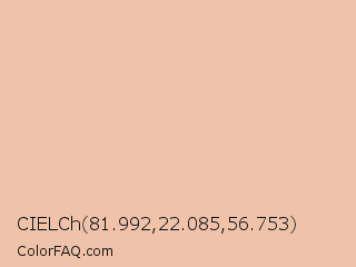 CIELCh 81.992,22.085,56.753 Color is a light orange color and the nearest color is Zinnwaldite #ebc2af. Hex code #efc3aa and RGB value is rgb(239,195,170). In RGB color space, this color is composed of 94% red, 76% green, 67% blue, In CMYK color space, this color is composed of 0% cyan, 18% magenta, 29% yellow , 6% black , In HSL color space, this color has a hue angle of 22° , 68% saturation and 80% lightness.