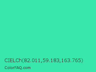 CIELCh 82.011,59.183,163.765 Color is a normal green color and the nearest color is Eucalyptus #44d7a8. Hex code #36e6ab and RGB value is rgb(54,230,171). In RGB color space, this color is composed of 21% red, 90% green, 67% blue, In CMYK color space, this color is composed of 77% cyan, 0% magenta, 26% yellow , 10% black , In HSL color space, this color has a hue angle of 160° , 78% saturation and 56% lightness.