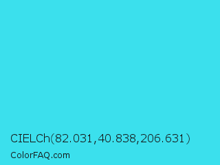 CIELCh 82.031,40.838,206.631 Color is a normal cyan color and the nearest color is Turquoise #40e0d0. Hex code #3be0ed and RGB value is rgb(59,224,237). In RGB color space, this color is composed of 23% red, 88% green, 93% blue, In CMYK color space, this color is composed of 75% cyan, 5% magenta, 0% yellow , 7% black , In HSL color space, this color has a hue angle of 184° , 83% saturation and 58% lightness.