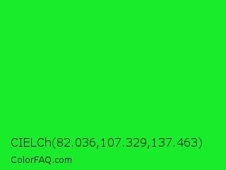 CIELCh 82.036,107.329,137.463 Color is a normal green color and the nearest color is Lime Green #32cd32. Hex code #19ec2a and RGB value is rgb(25,236,42). In RGB color space, this color is composed of 10% red, 93% green, 16% blue, In CMYK color space, this color is composed of 89% cyan, 0% magenta, 82% yellow , 7% black , In HSL color space, this color has a hue angle of 125° , 85% saturation and 51% lightness.