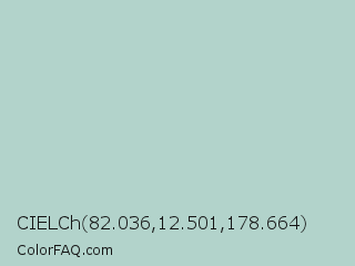 CIELCh 82.036,12.501,178.664 Color is a light cyan color and the nearest color is Jet Stream #b5d2ce. Hex code #b2d3cb and RGB value is rgb(178,211,203). In RGB color space, this color is composed of 70% red, 83% green, 80% blue, In CMYK color space, this color is composed of 16% cyan, 0% magenta, 4% yellow , 17% black , In HSL color space, this color has a hue angle of 165° , 27% saturation and 76% lightness.