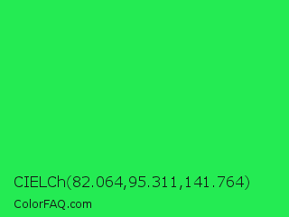 CIELCh 82.064,95.311,141.764 Color is a normal green color and the nearest color is Malachite #0bda51. Hex code #24eb53 and RGB value is rgb(36,235,83). In RGB color space, this color is composed of 14% red, 92% green, 33% blue, In CMYK color space, this color is composed of 85% cyan, 0% magenta, 65% yellow , 8% black , In HSL color space, this color has a hue angle of 134° , 83% saturation and 53% lightness.