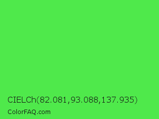 CIELCh 82.081,93.088,137.935 Color is a normal green color and the nearest color is Screamin Green #66ff66. Hex code #4fe94b and RGB value is rgb(79,233,75). In RGB color space, this color is composed of 31% red, 91% green, 29% blue, In CMYK color space, this color is composed of 66% cyan, 0% magenta, 68% yellow , 9% black , In HSL color space, this color has a hue angle of 118° , 78% saturation and 60% lightness.