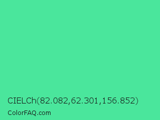 CIELCh 82.082,62.301,156.852 Color is a normal green color and the nearest color is Eucalyptus #44d7a8. Hex code #4ae69c and RGB value is rgb(74,230,156). In RGB color space, this color is composed of 29% red, 90% green, 61% blue, In CMYK color space, this color is composed of 68% cyan, 0% magenta, 32% yellow , 10% black , In HSL color space, this color has a hue angle of 152° , 76% saturation and 60% lightness.