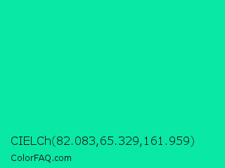 CIELCh 82.083,65.329,161.959 Color is a normal green color and the nearest color is Medium Spring Green #00fa9a. Hex code #09e8a4 and RGB value is rgb(9,232,164). In RGB color space, this color is composed of 4% red, 91% green, 64% blue, In CMYK color space, this color is composed of 96% cyan, 0% magenta, 29% yellow , 9% black , In HSL color space, this color has a hue angle of 162° , 93% saturation and 47% lightness.
