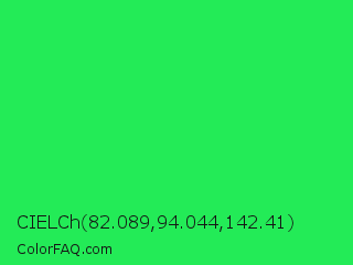 CIELCh 82.089,94.044,142.41 Color is a normal green color and the nearest color is Malachite #0bda51. Hex code #23eb57 and RGB value is rgb(35,235,87). In RGB color space, this color is composed of 14% red, 92% green, 34% blue, In CMYK color space, this color is composed of 85% cyan, 0% magenta, 63% yellow , 8% black , In HSL color space, this color has a hue angle of 136° , 83% saturation and 53% lightness.