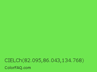 CIELCh 82.095,86.043,134.768 Color is a light green color and the nearest color is Screamin Green #66ff66. Hex code #6ee64f and RGB value is rgb(110,230,79). In RGB color space, this color is composed of 43% red, 90% green, 31% blue, In CMYK color space, this color is composed of 52% cyan, 0% magenta, 66% yellow , 10% black , In HSL color space, this color has a hue angle of 108° , 75% saturation and 61% lightness.