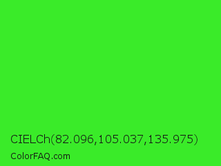 CIELCh 82.096,105.037,135.975 Color is a normal green color and the nearest color is Neon Green #39ff14. Hex code #3aeb29 and RGB value is rgb(58,235,41). In RGB color space, this color is composed of 23% red, 92% green, 16% blue, In CMYK color space, this color is composed of 75% cyan, 0% magenta, 83% yellow , 8% black , In HSL color space, this color has a hue angle of 115° , 83% saturation and 54% lightness.