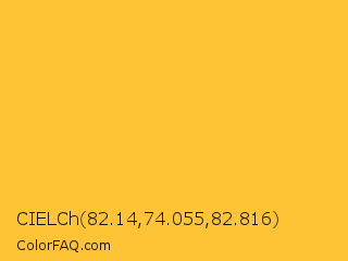 CIELCh 82.14,74.055,82.816 Color is a light orange color and the nearest color is Sunglow #ffcc33. Hex code #ffc336 and RGB value is rgb(255,195,54). In RGB color space, this color is composed of 100% red, 76% green, 21% blue, In CMYK color space, this color is composed of 0% cyan, 24% magenta, 79% yellow , 0% black , In HSL color space, this color has a hue angle of 42° , 100% saturation and 61% lightness.