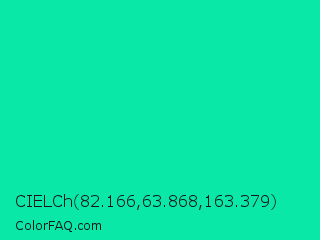 CIELCh 82.166,63.868,163.379 Color is a normal green color and the nearest color is Medium Spring Green #00fa9a. Hex code #0ae8a8 and RGB value is rgb(10,232,168). In RGB color space, this color is composed of 4% red, 91% green, 66% blue, In CMYK color space, this color is composed of 96% cyan, 0% magenta, 28% yellow , 9% black , In HSL color space, this color has a hue angle of 163° , 92% saturation and 47% lightness.