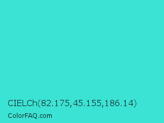CIELCh 82.175,45.155,186.14 Color is a normal cyan color and the nearest color is Turquoise #40e0d0. Hex code #3be3d4 and RGB value is rgb(59,227,212). In RGB color space, this color is composed of 23% red, 89% green, 83% blue, In CMYK color space, this color is composed of 74% cyan, 0% magenta, 7% yellow , 11% black , In HSL color space, this color has a hue angle of 175° , 75% saturation and 56% lightness.