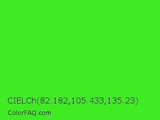 CIELCh 82.182,105.433,135.23 Color is a normal green color and the nearest color is Neon Green #39ff14. Hex code #40eb24 and RGB value is rgb(64,235,36). In RGB color space, this color is composed of 25% red, 92% green, 14% blue, In CMYK color space, this color is composed of 73% cyan, 0% magenta, 85% yellow , 8% black , In HSL color space, this color has a hue angle of 112° , 83% saturation and 53% lightness.