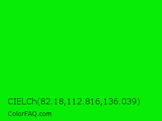 CIELCh 82.18,112.816,136.039 Color is a normal green color and the nearest color is Green #00ff00. Hex code #08ed05 and RGB value is rgb(8,237,5). In RGB color space, this color is composed of 3% red, 93% green, 2% blue, In CMYK color space, this color is composed of 97% cyan, 0% magenta, 98% yellow , 7% black , In HSL color space, this color has a hue angle of 119° , 96% saturation and 47% lightness.