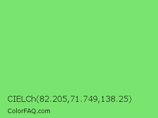 CIELCh 82.205,71.749,138.25 Color is a light green color and the nearest color is Pastel Green #77dd77. Hex code #79e46e and RGB value is rgb(121,228,110). In RGB color space, this color is composed of 47% red, 89% green, 43% blue, In CMYK color space, this color is composed of 47% cyan, 0% magenta, 52% yellow , 11% black , In HSL color space, this color has a hue angle of 114° , 69% saturation and 66% lightness.